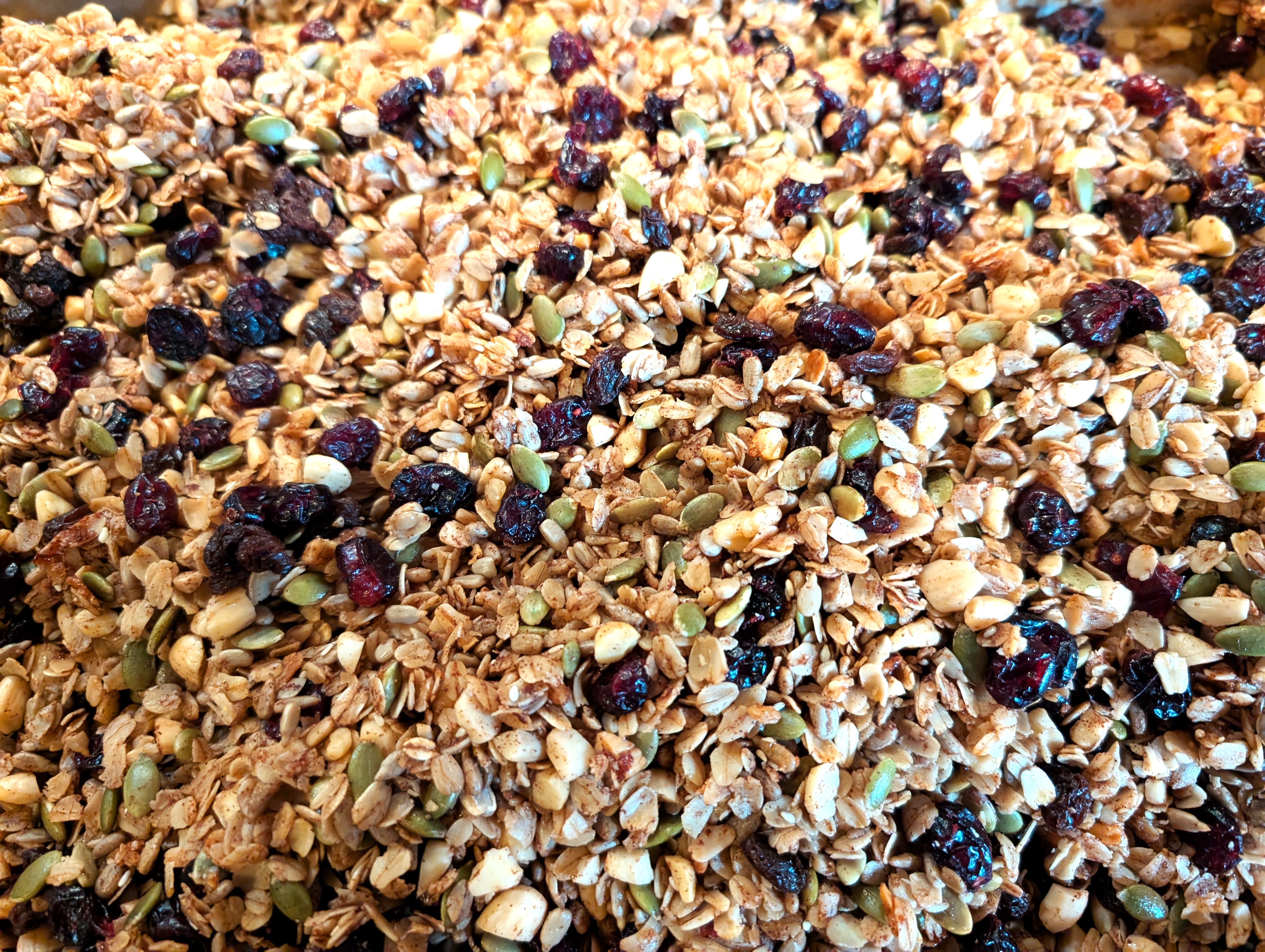 This makes enough to fill two gallon-sized bags of granola. You can adjust the ingredients to use whatever nuts, fruit, spices, or sugars you want. When I made this, I added pumpkin seeds and substituted some rose syrup for the maple syrup since I had some I needed to use up. Cardamom is a great alternative for cinnamon with rose syrup. I also used almond extract in place of vanilla because of personal tastes. This is very much a “you do you” sort of recipe, so feel free to play around based on your personal tastes.