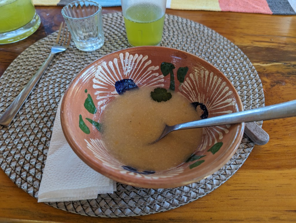 This recipe comes from Quinta Brava in Oaxaca, where my spouse and I took a cooking class. They gave us recipes at the end and I’ve saved this one as a light, refreshing soup. It’s less of a full meal than part of a multi-course affair, though you could probably put more into it if you want something more filling.