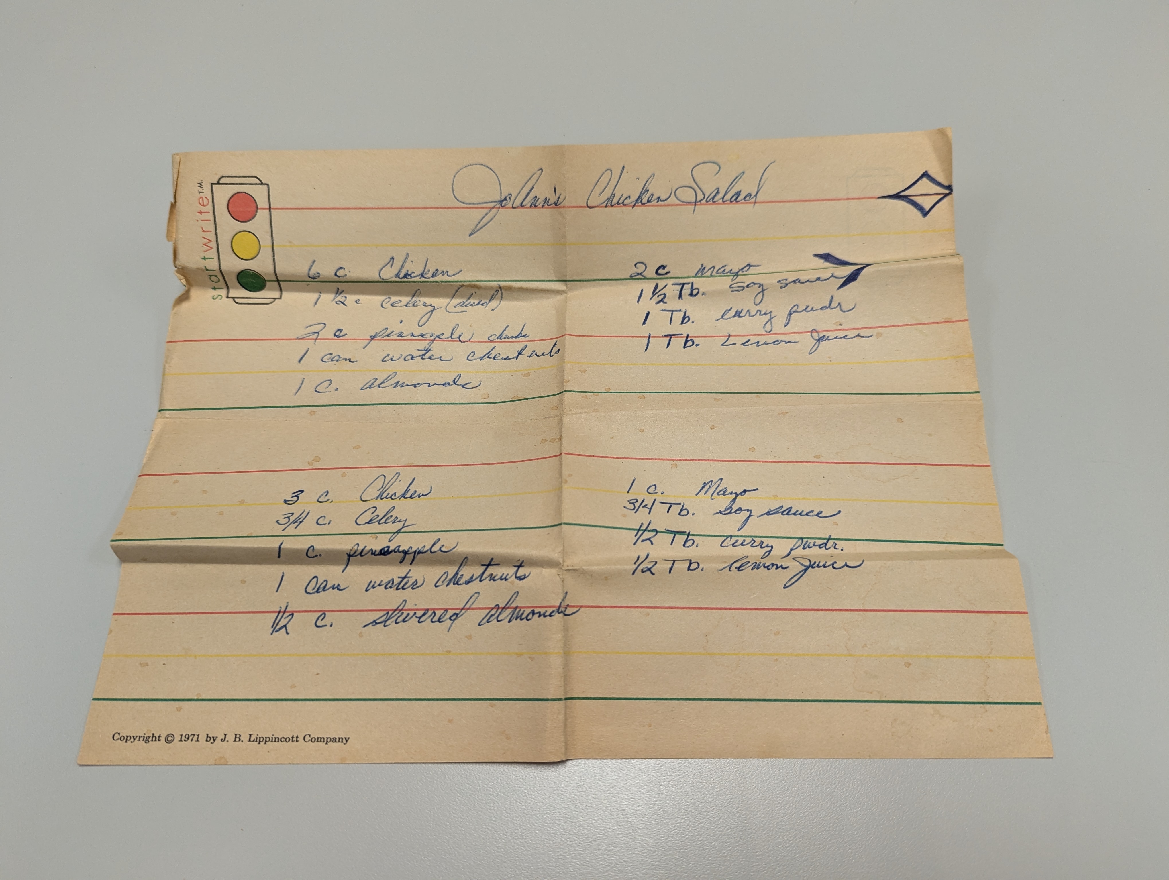 My mom wrote this out on the same kind of paper that I used to do my homework in first grade in the early 1980s, all yellowed and fragile now. There are some doodles added, like my mom wrote it down while on the phone with Aunt Joann.