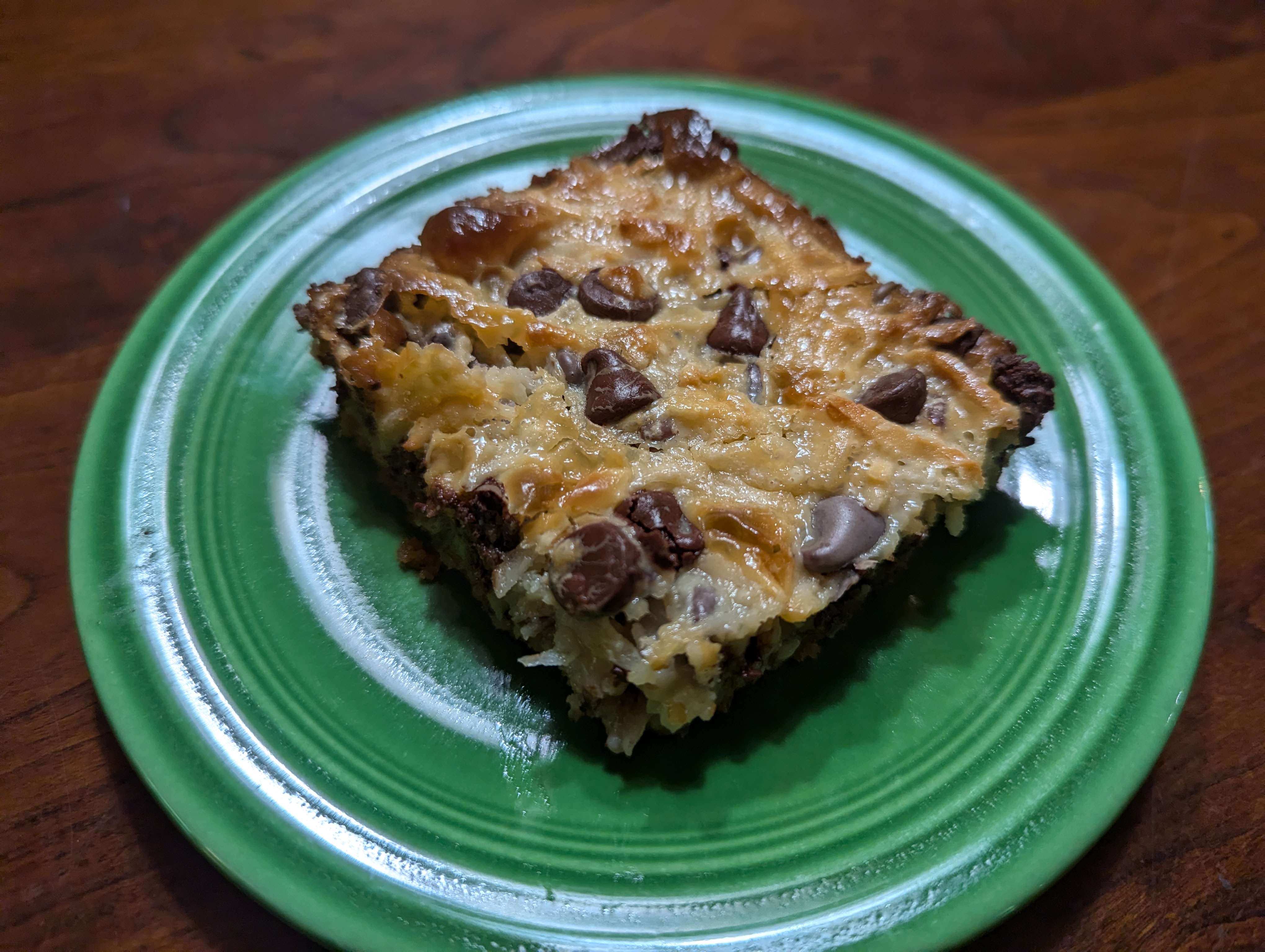 Pour melted butter onto the bottom of a 13 x 9 x 2″ pan. Sprinkle the graham cracker crumbs over butter. (Pro tip: press the crumbs into the butter to help them hold together as a crust.) Sprinkle nuts over the crumbs. Scatter chocolate chips over nuts. Then sprinkle coconut over chips. Pour milk over coconut.