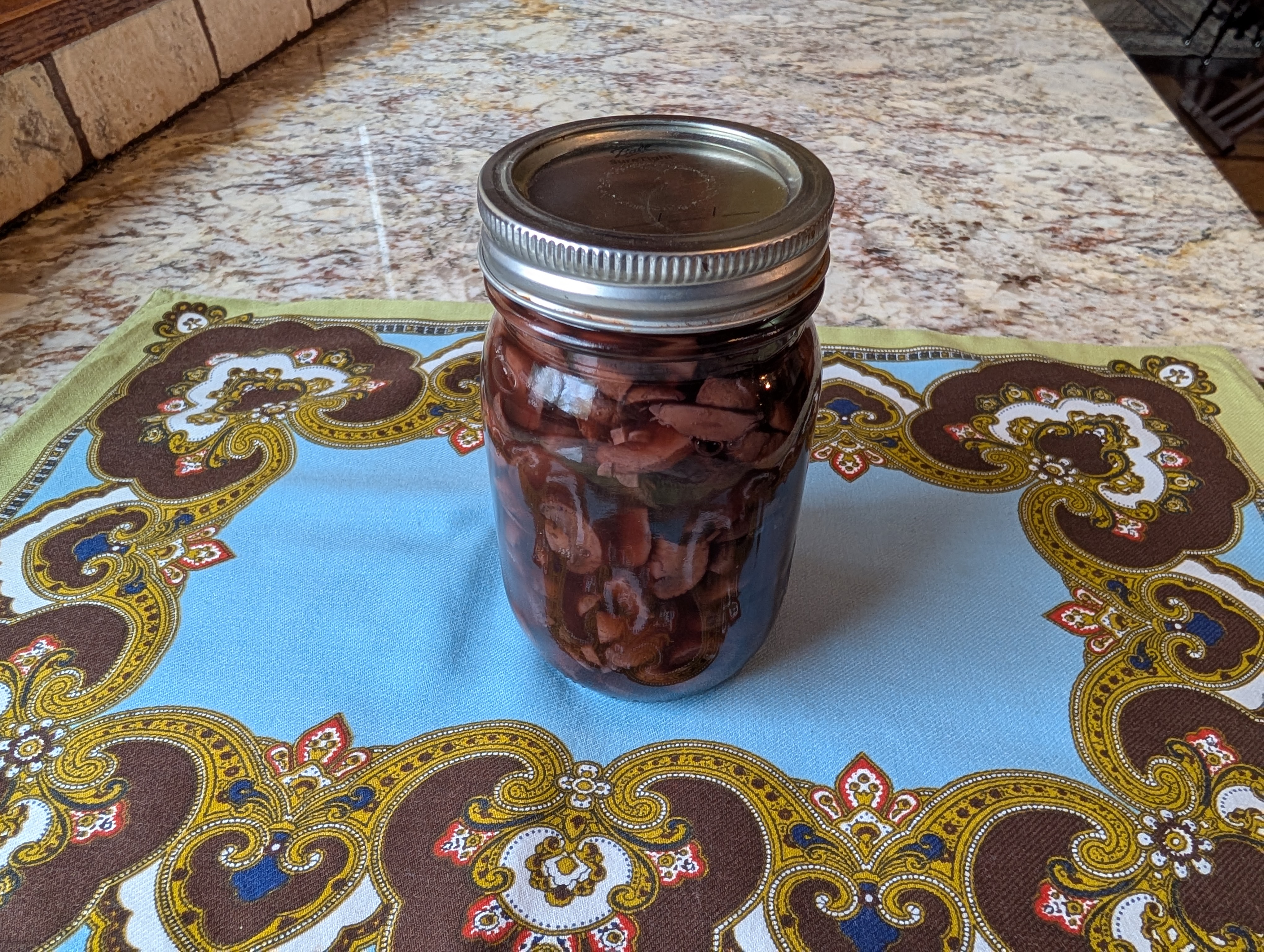 This is a classic Russian recipe from a country that has made pickling an art form. It’s pretty easy to make; a single batch makes a little more than a one-pint jar’s worth if you chop up the mushrooms. If you leave them whole, it will probably make more, but I was starting with pre-sliced mushrooms because they were on sale and then it felt weird to leave them as slices. Regardless of the shape, they’re still tasty on their own or could be added to other recipes or topped on a burger. Recipe from Russian Regional Recipes by Susan Ward (Hackberry Press: Dallas, 2003).