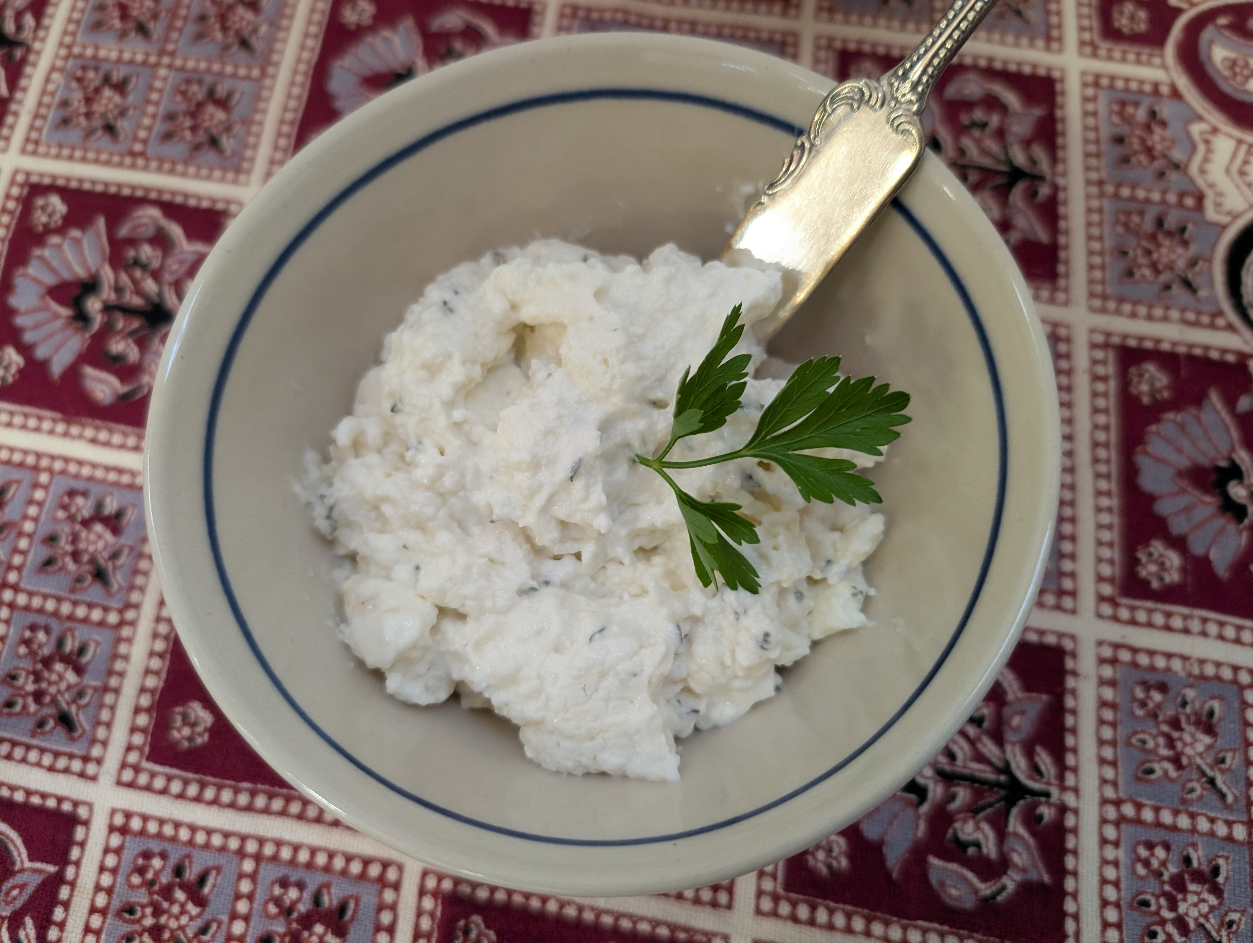 This is a Viking recipe shared by Cara Watters. It’s definitely soft, softer than cream cheese. The garlic and thyme gives it a lovely punch, though you can leave it out or substitute other flavors. It’s great smeared on bread or a bagel.