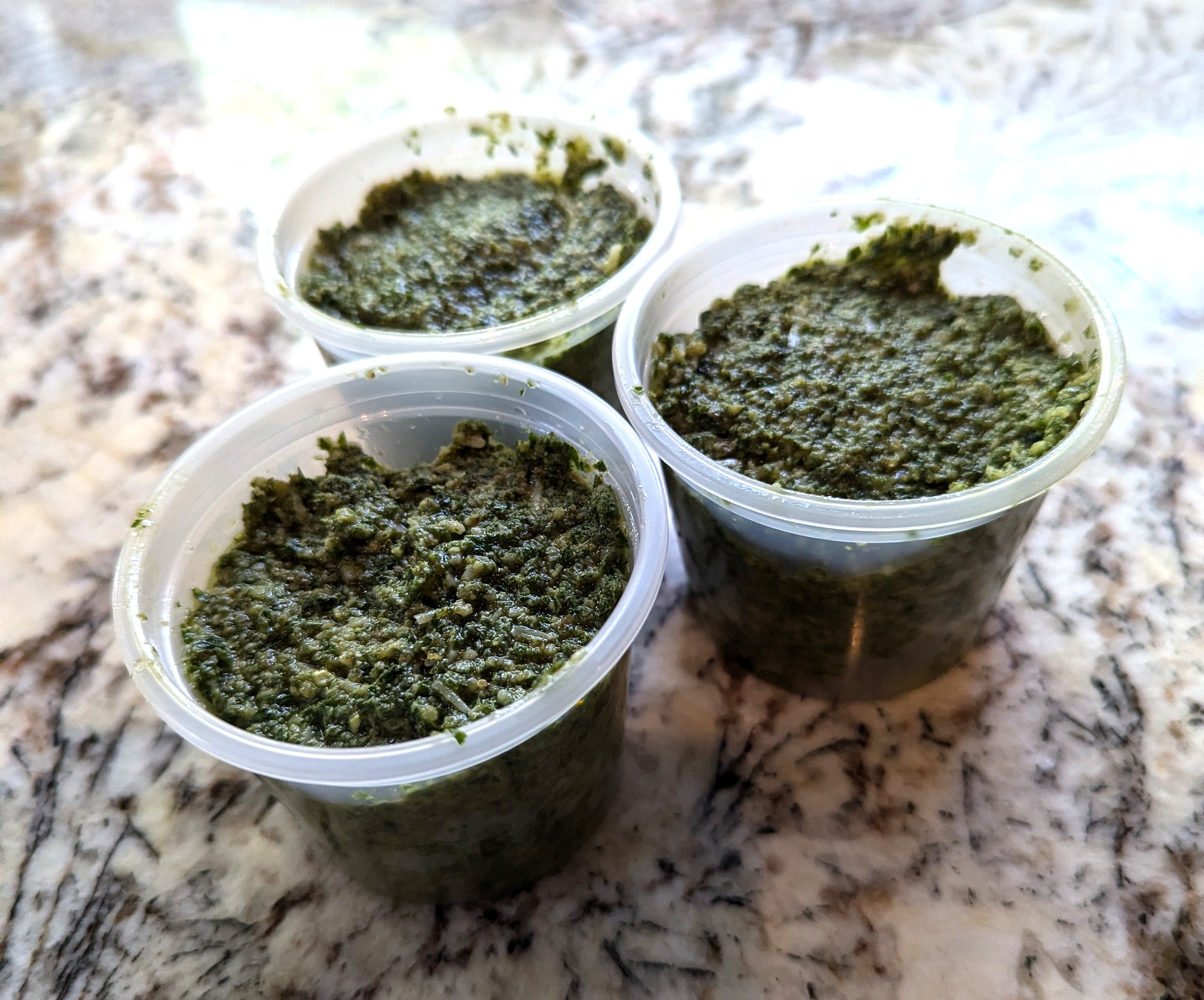 Put everything except the parmesan in a food processor and reduce it to a gooey pulp. Pour into a bowl and add the parmesan. Divide into cups or ice cube trays for freezing. A double batch makes about 8 4-oz. cups.
