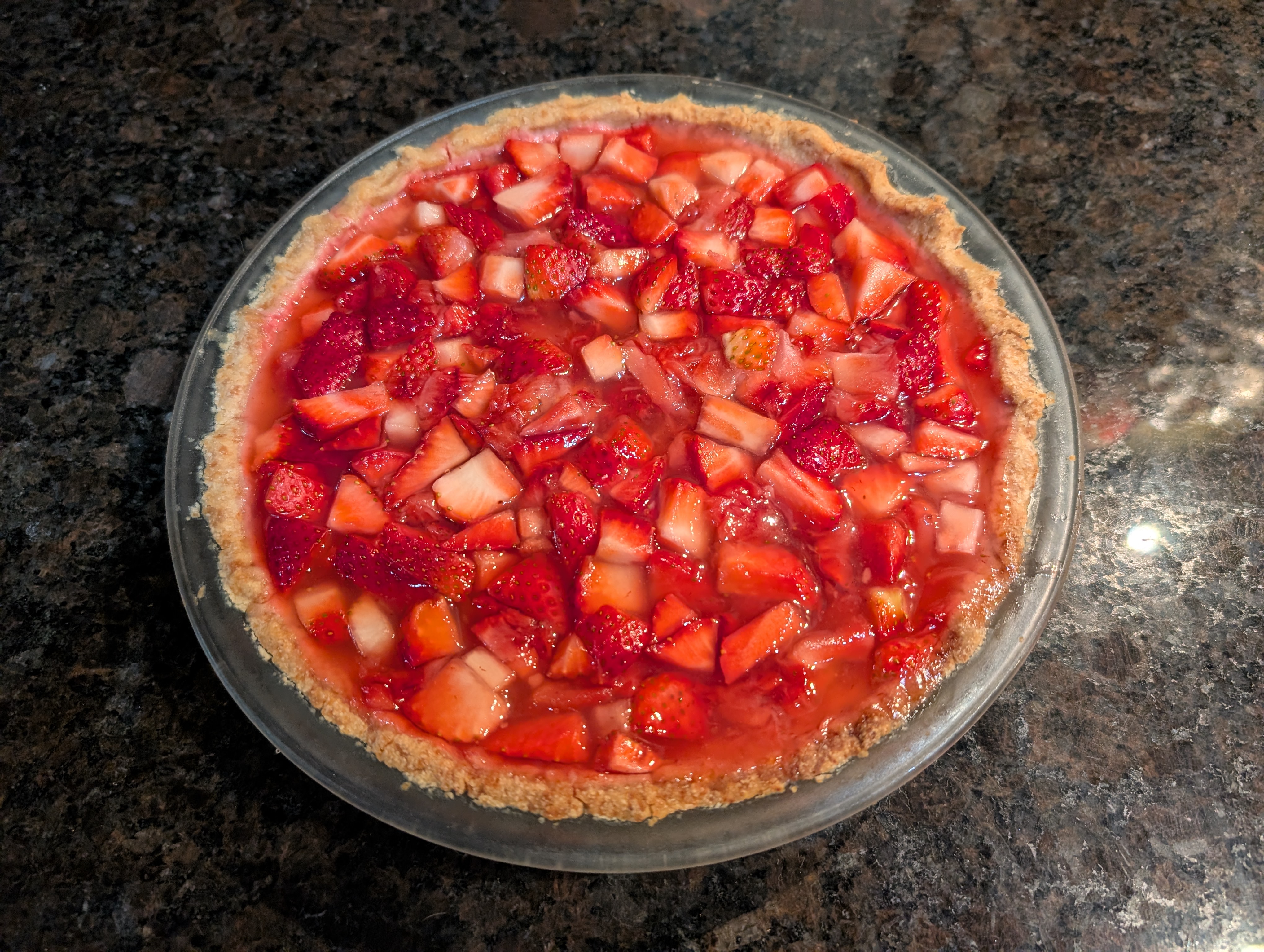 Add the rest of the ingredients to a saucepan. Cook until clear. Pour over berries. (I did this in a bowl and stirred before transferring to the pie crust. It’s possible that my mix wasn’t clear enough before I took it off the heat; I don’t know how much it should have boiled down, or why I needed to start with cold water if it was just going to boil anyway.)