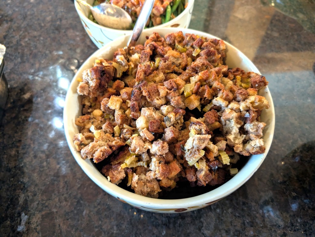 Aunt Jane always made this at Thanksgiving and it’s hard to imagine the holidays at her house without it. Nonetheless, it’s not a recipe for the faint of heart! Making this requires lots of concentration and prep work, and just about all the kitchen verbs, but the taste is worth it. Her original recipe is at the bottom, but first is my version that I’ve modified to use more herbs and simplify some of the ingredients and steps.
