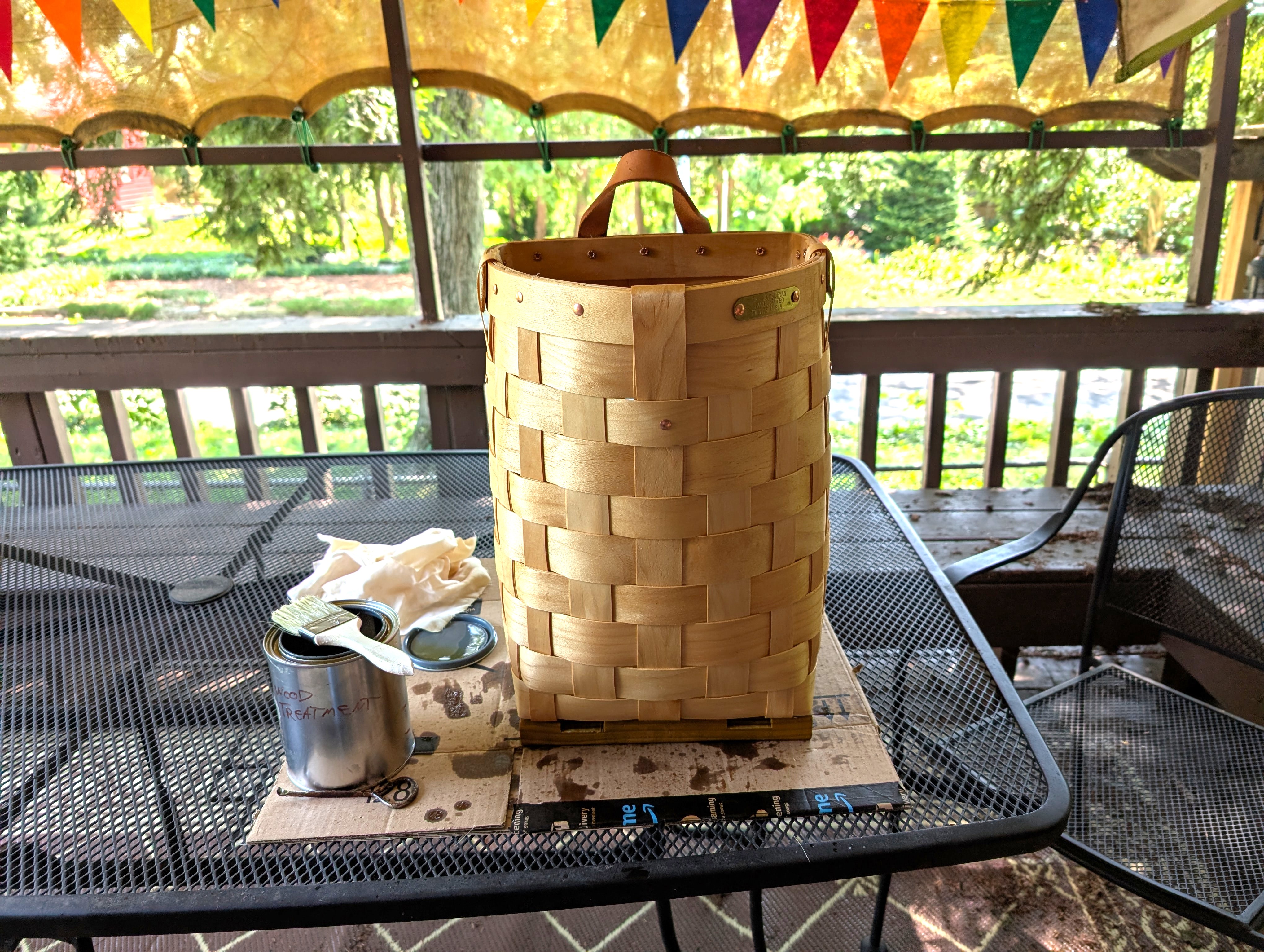 There is no stain in this, but it will darken pale wood to a nice golden color. Darker woods will darken a little more. I used it on a poplar basket, which had a very pale color when untreated (below). Two coats doesn’t create a smooth gloss the way polyurethane alone would. It’s possible that more coats will do this eventually, but Uncle Allen’s recipe said to finish the wood with a wax paste, which would add a little smoothness and shine. I just applied two coats yesterday, so I may post an update later on if I try applying with wax.