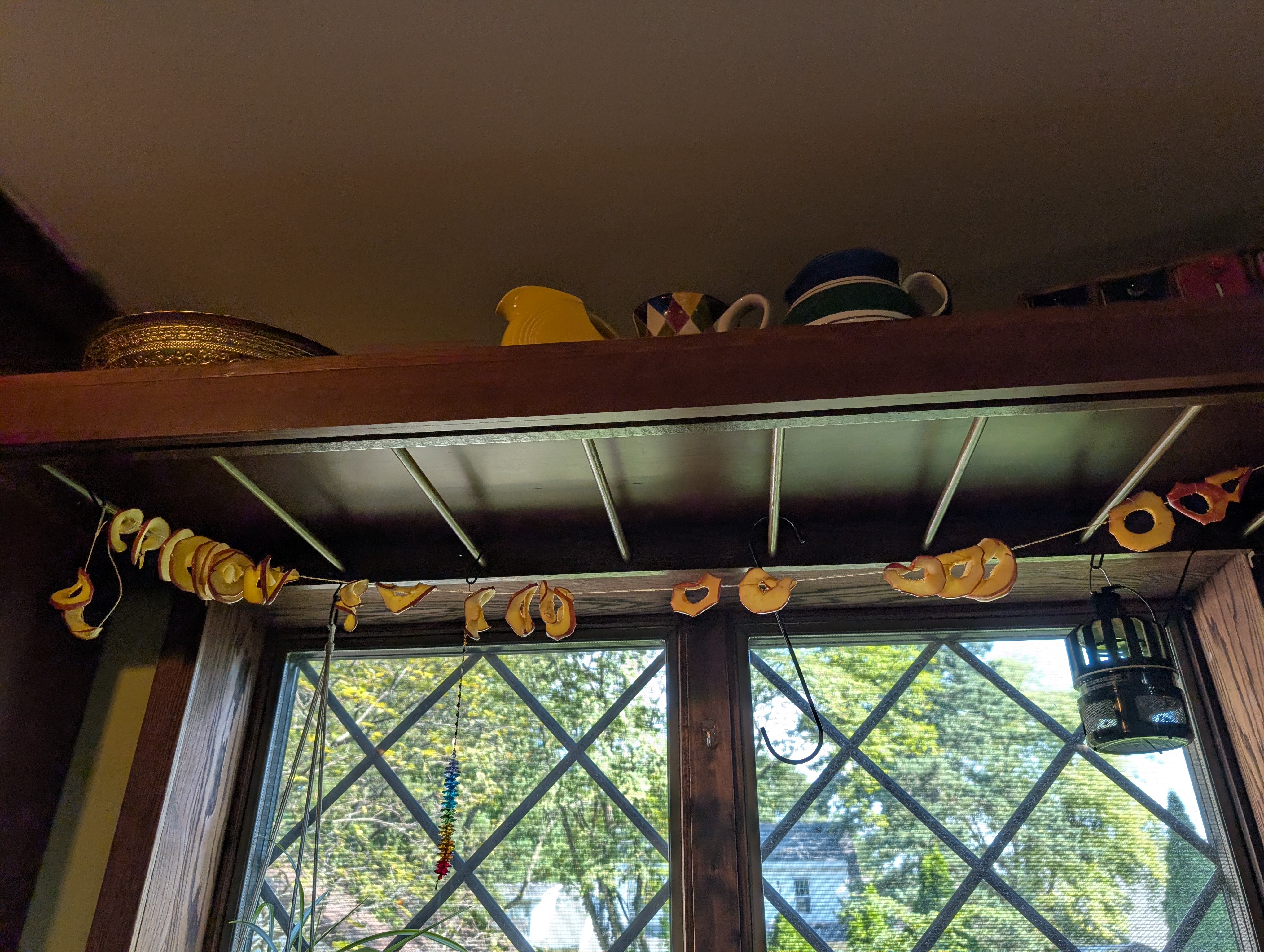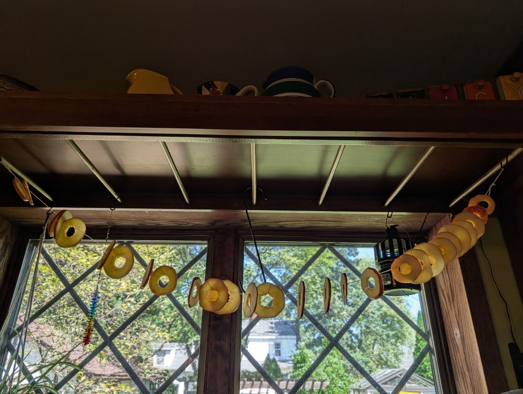 In the photo above, I tried to ensure space by tying a knot around each slice. However, the string pulled through several slices within the first few hours, effectively cutting them loose and making the string hang lower as the knots tightened. The picture above was taken shortly after hanging them. Already, the string was hanging lower than I wanted but moving the string cut through a few more slices and knocked them down.