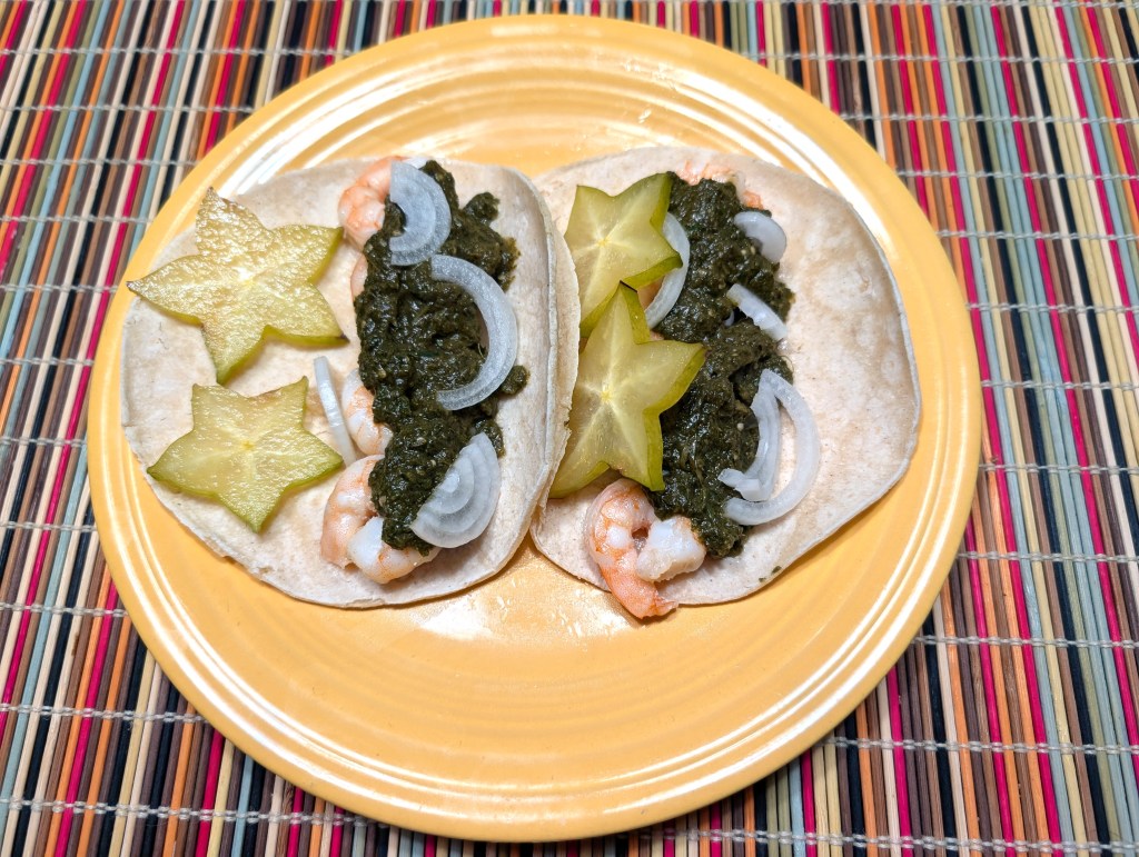 Roughly chop the tomatillos and onion. Fry or toast with the garlic until brown (i.e., ~30 minutes in a toaster oven).