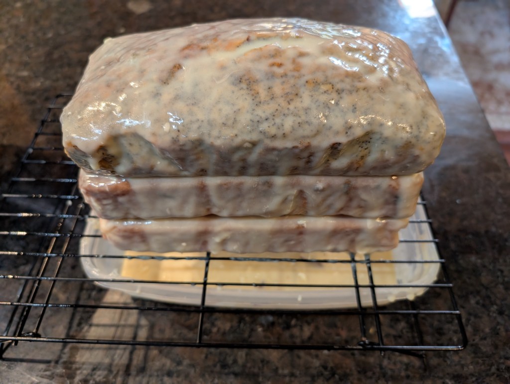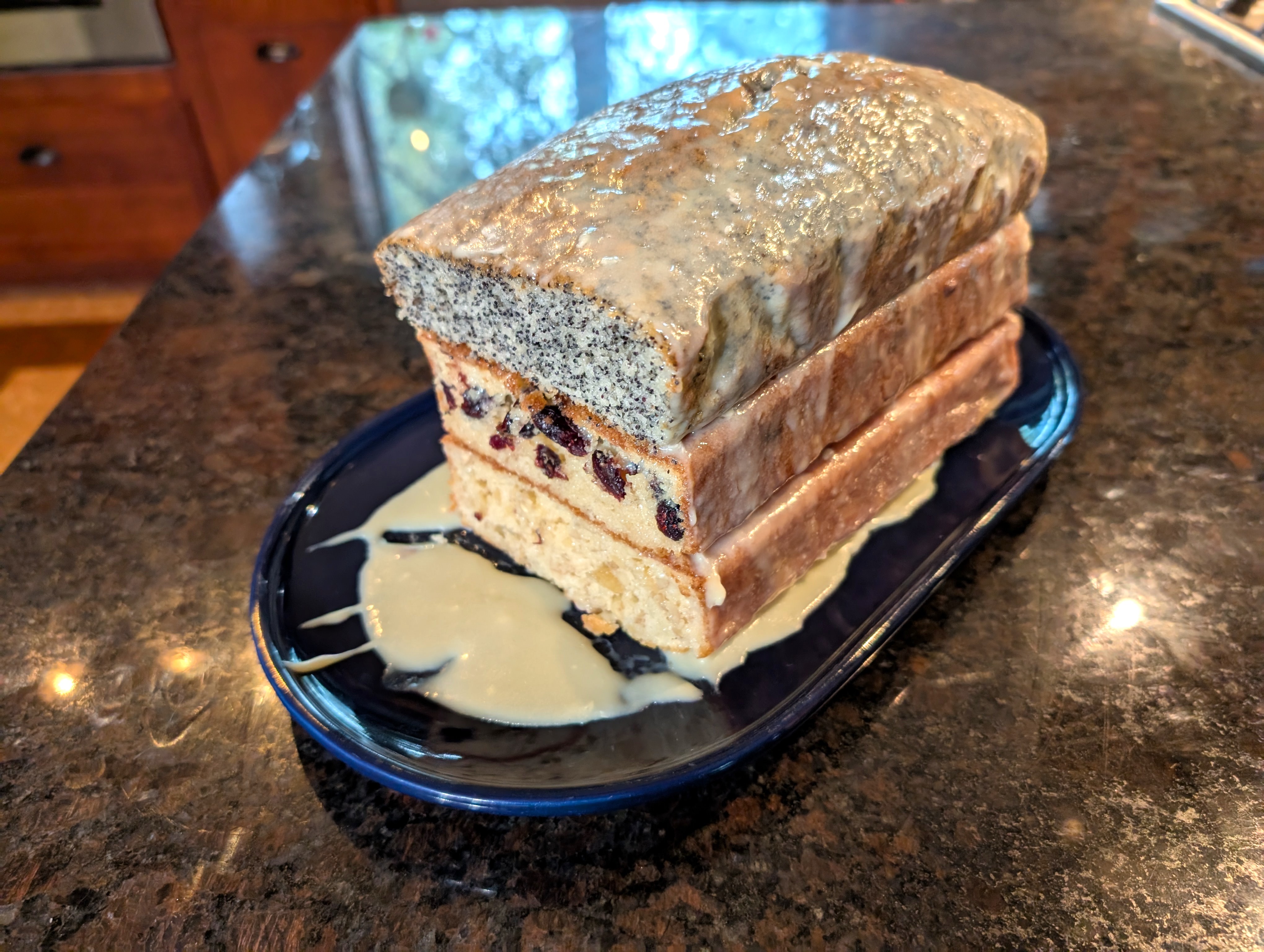 Gently mix in the almonds/almond extract, cranberries/blueberry extract, or poppyseeds/lemon extract. (It’s good to start with the heaviest layer first, then the next heaviest, so the lightest layer will be on the top of the cake.)