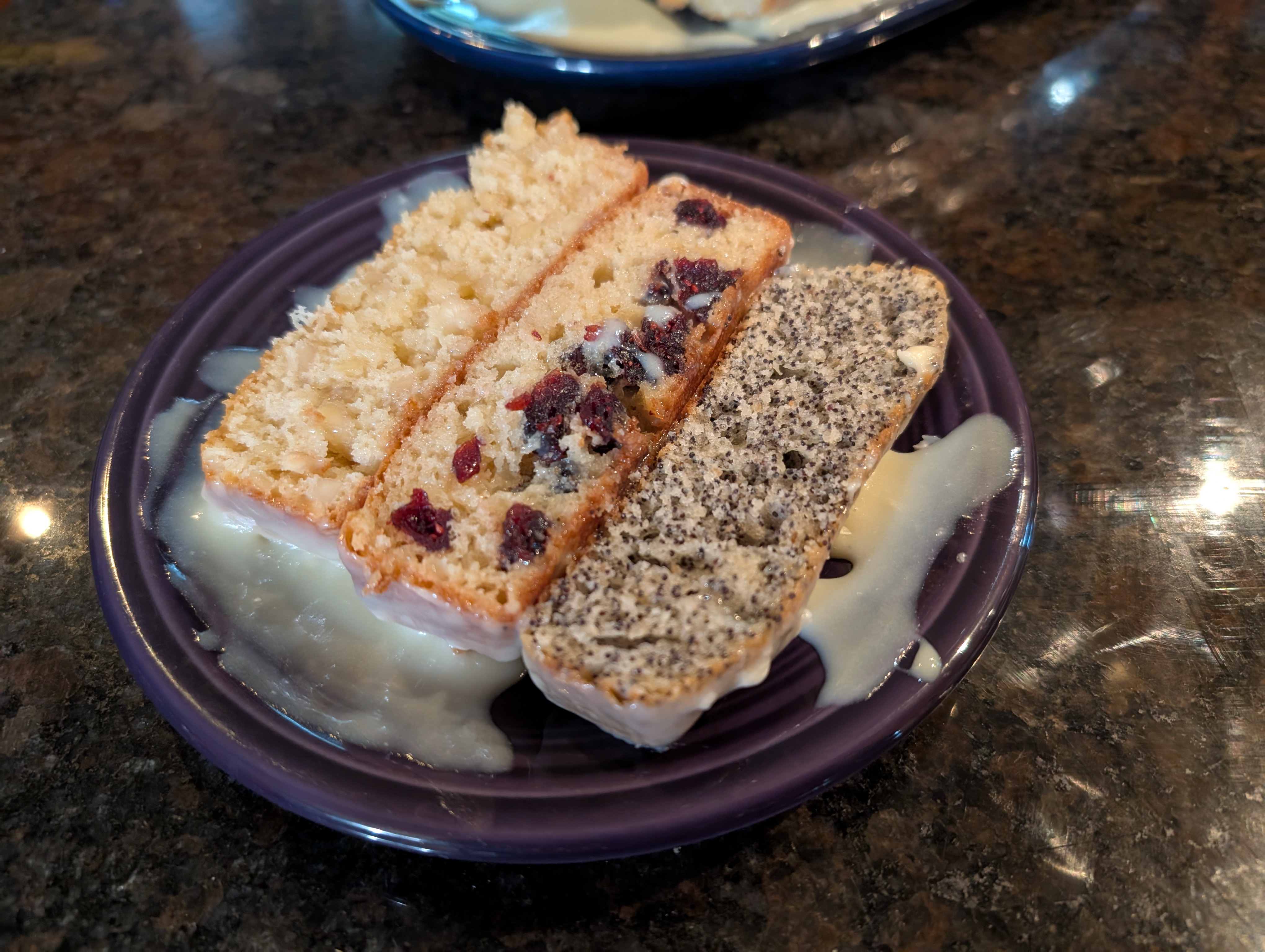 I’ve changed it a bit to use flavors I thought would go together: lemon poppyseed, cranberry/blueberry, and almond. Feel free to play around with other flavors. It’s ideal to use a combination of flavors that won’t clash with each other, but even if you do get a layer that doesn’t quite “go” with the others, you can easily separate it as this is a very modular design.