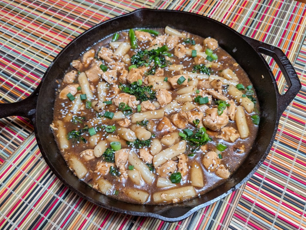 I was inspired by this recipe, which is more of a side dish with fish cakes than a full meal. But this dish is saucy enough to support even more than the chicken and broccoli rabe that I added, so I think it could be customized to suit whichever protein or vegetables you feel like adding. As such, I think it’s fair to say this is more of a Korean-inspired fusion dish than anything authentic (besides the fact that I myself am not Korean) — but the result was delicious and I look forward to making it again.