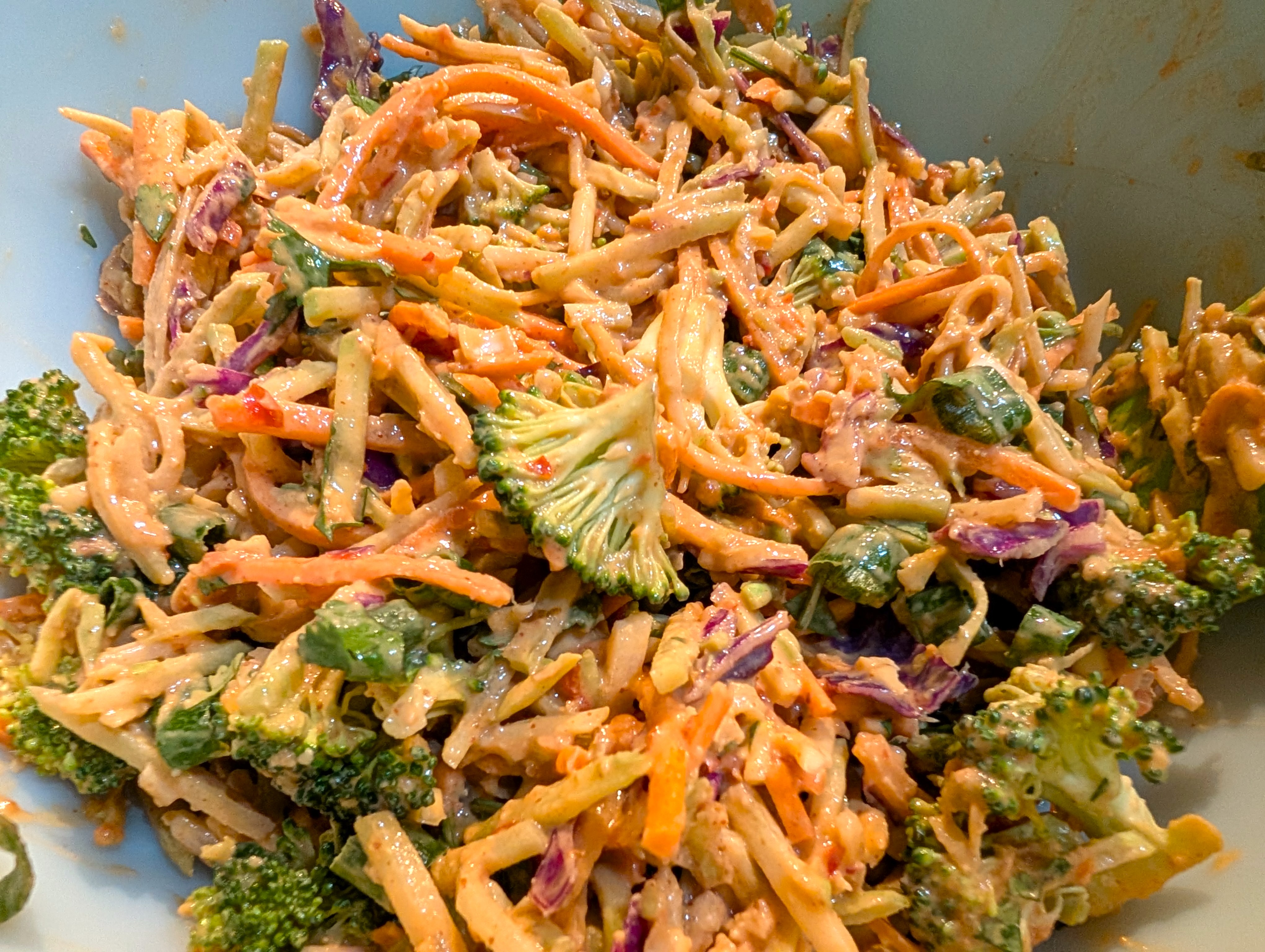 This slaw combines the crunch of fresh veggies with a peanut chili sauce that pairs well with Asian food, especially satay.