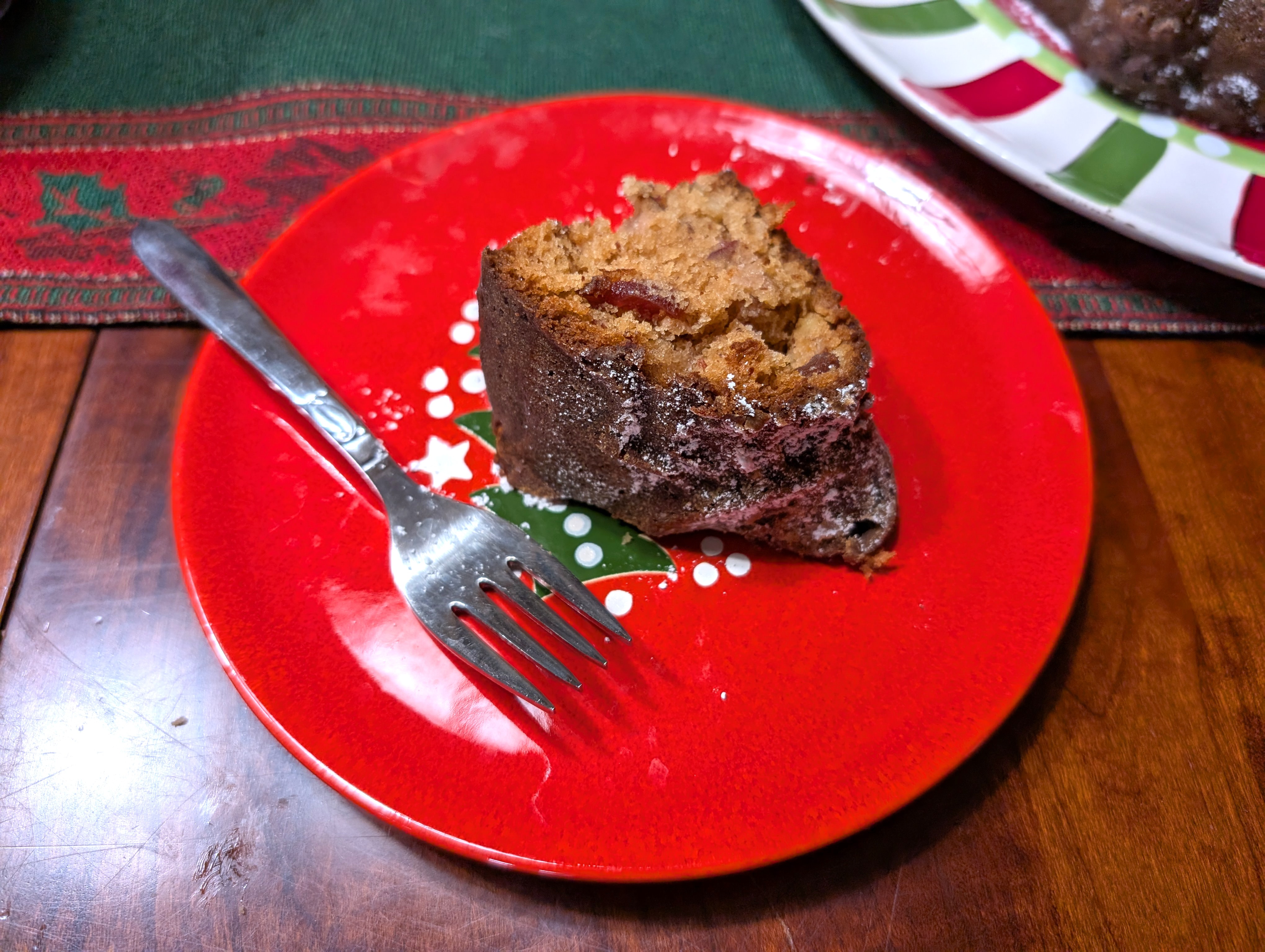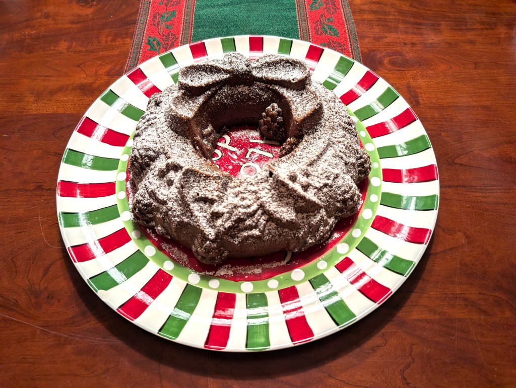 This rich, moist cake is a very delicious holiday treat full of almond and cherry flavor. It’s one that my Dad introduced me to. It also makes a lot — I had more batter than would fit in my holiday Bundt pan, so I made a second cake in a 5-inch round cake pan.