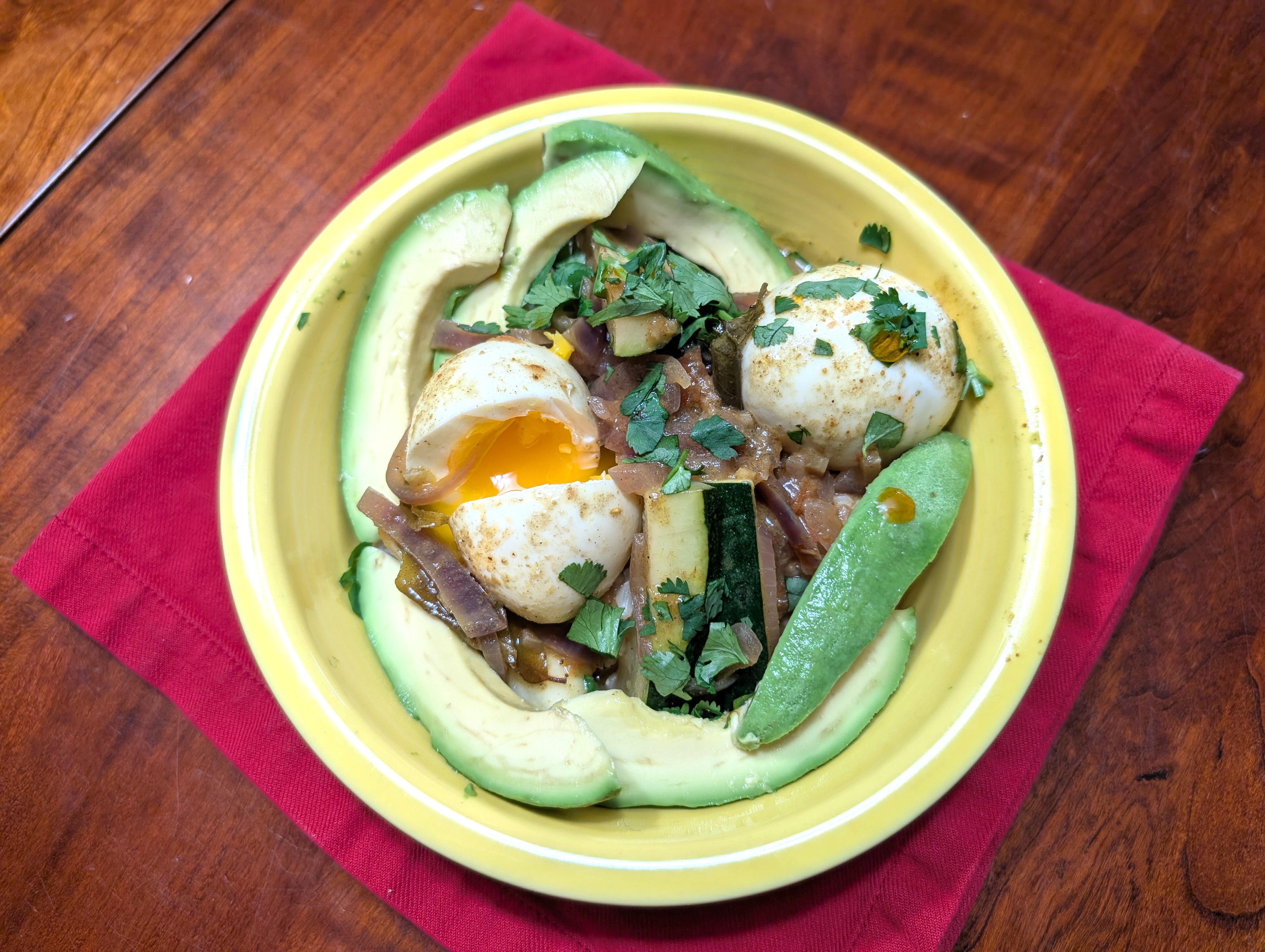A friend recently introduced me to this Sri Lankan egg curry recipe and I’m really happy I gave it a try. It’s just spicy enough to clear out the sinuses, and the soft-boiled eggs blend in with the sauce in a delightfully creamy way. I added zucchini to give it a vegetable and garnished with an avocado — which isn’t a traditional part of Sri Lankan cuisine, but it goes well with spicy food (and I needed to use it before it went bad).