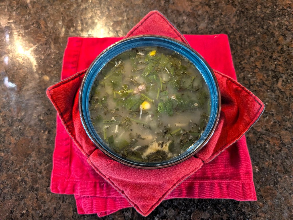 I have no idea if this is anything like what it’s meant to be, but it’s tasty. It’s a chicken soup with plenty of vitamin-rich spinach, a little corn, and a unique flavor coming from the mint.