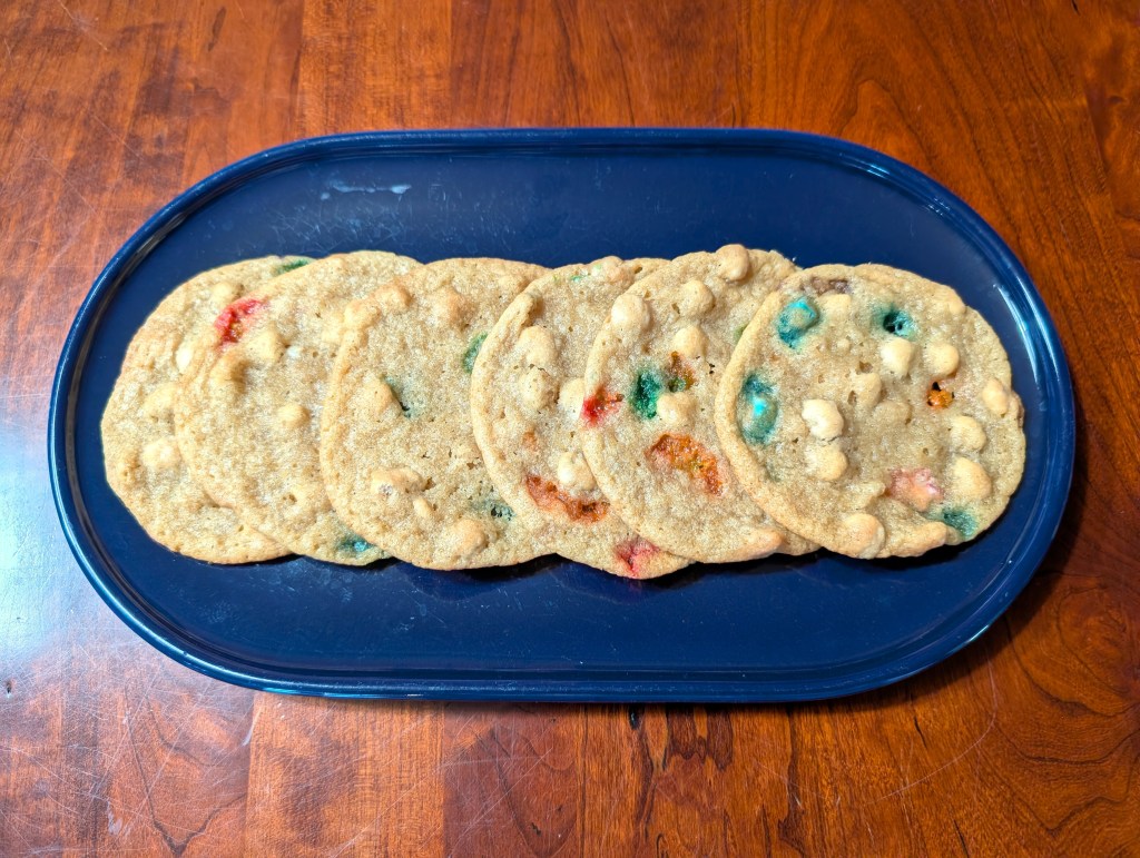 The cookie flavor is just about as Irish as the cereal, which is to say, not a whole hell of a lot, but it’s fun for kids. Cereal bits add a little crunch to otherwise simple cookies. Cereal marshmallows tend to melt in the oven in somewhat interesting ways that have nothing to do with their original shapes. This batch spread out really wide and thin — the original recipe didn’t say to chill the dough before baking, which in retrospect would have curbed this effect. I’ve modified the version below accordingly.