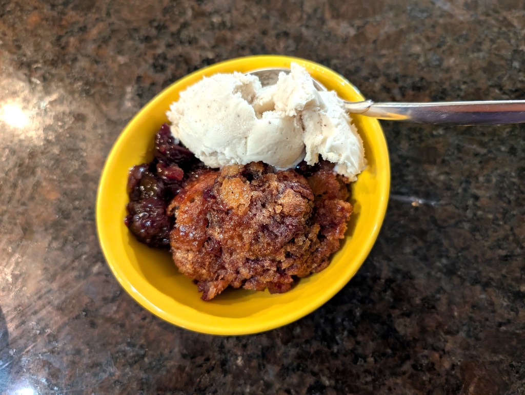 I was a little skeptical about how this would turn out. The recipe itself is very simple, and it doesn’t fill much of the pan. But the result is a mix of soft, bready pudding and baked cherries. It’s delicious served warm with a scoop of vanilla ice cream, or try adding some sweet cream sauce.