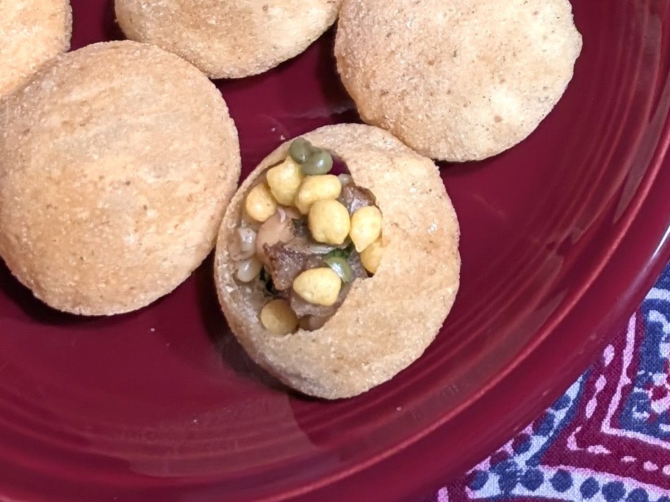 First, you start with the puri, which are crunchy, hollow puffs. You tap the top to create an opening, then fill it with a bean/potato mix. Add some boondi, which are smaller crunchy puffs. Top it off with the pani, which is a watery sauce with the consistency of soup broth, and pop it into your mouth quickly before it falls apart. You get the crunch, the savory bean mix, and the soupy sauce all at once to inundate the senses with multiple textures and flavors.