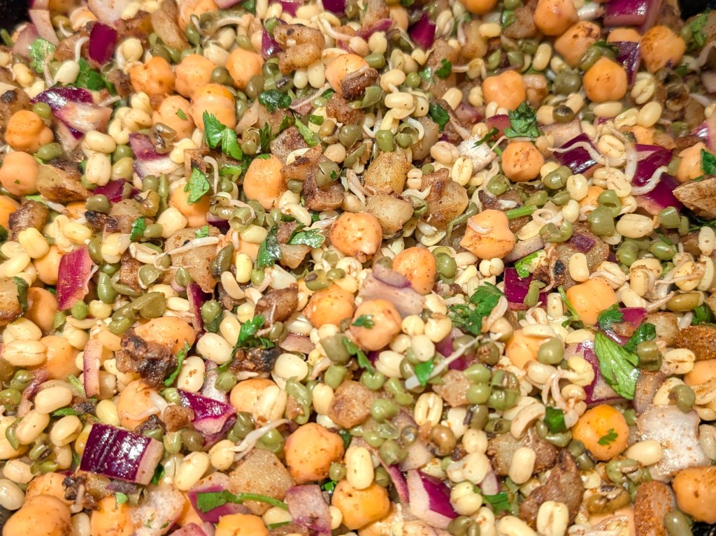 *It takes 2-3 days to sprout mung beans. If you don’t have that kind of time, you’ll just need to add 10-15 minutes to your boil time. Sprouting adds another texture to the mix, which is worth trying if you have the time. Start with a 1/2 cup of dried beans and soak for 24 hours, changing the water every 8 hours. Then drain and move the beans to a colander over a bowl, and cover with a tea towel. Spray with water every 8-12 hours until the beans have sprouts roughly 1/2 an inch long.