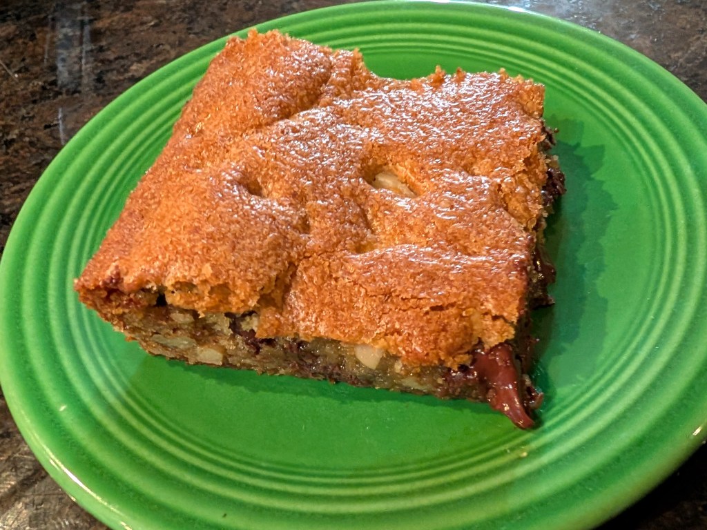 This is a chocolate chip cookie in tray bake form, very similar to a blondie. When it’s fresh out of the oven, it’s wonderfully warm and gooey. Later on, you can heat them in the microwave for 5-10 minutes if you want to reclaim that sensation. Nuts add a little crunch, though you can leave them out just as easily. I used a combination of almonds and walnuts in the batch shown above.