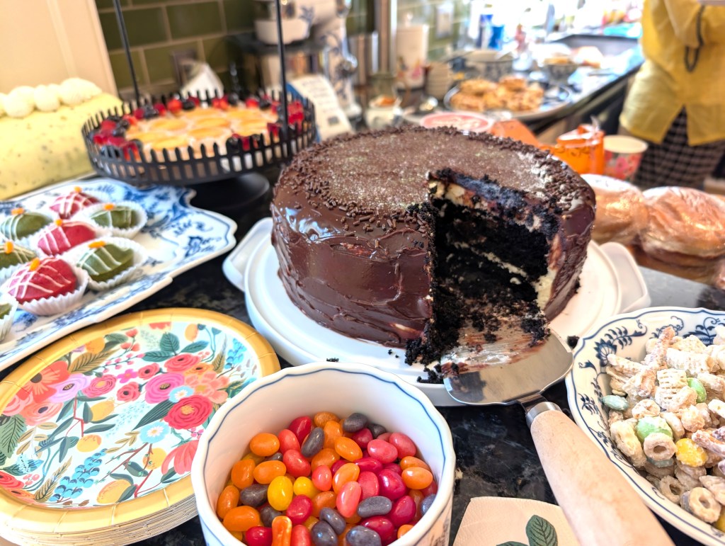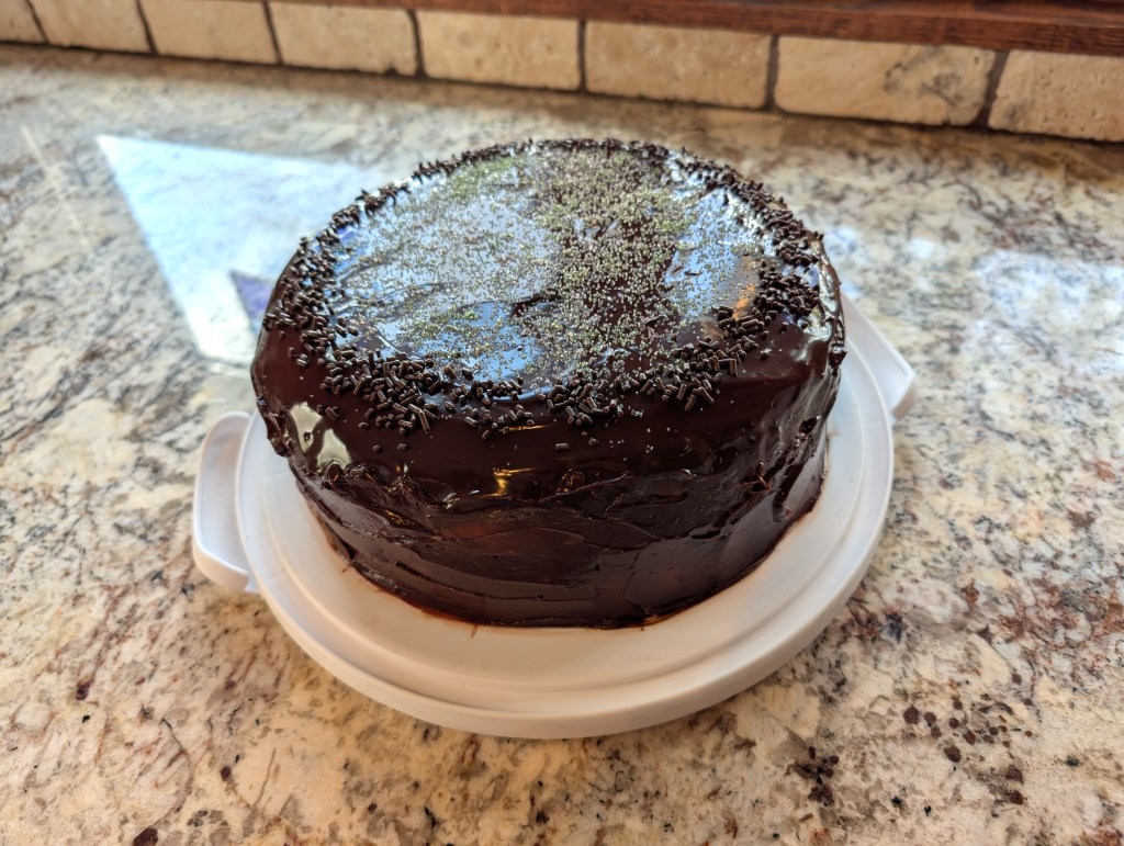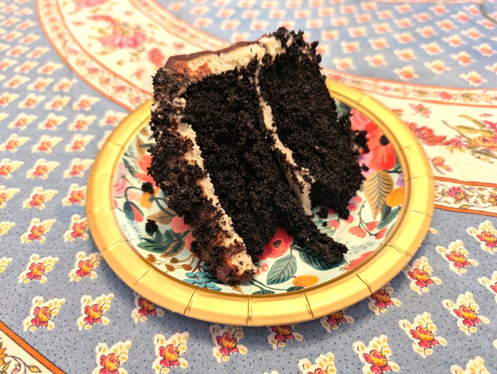This cake is what you get when you combine Irish Cream / Bailey’s liqueur, chocolate cake, buttercream frosting, and chocolate ganache. I was invited to an Easter potluck by a friend who came across something like this and was trying to find a professional baker in town who could make it, without success, so my spouse raised my hand and suggested I could do it. And, because it looked delicious, I rose to the challenge. I’m glad I did, because this was as delicious as the original recipe promised!