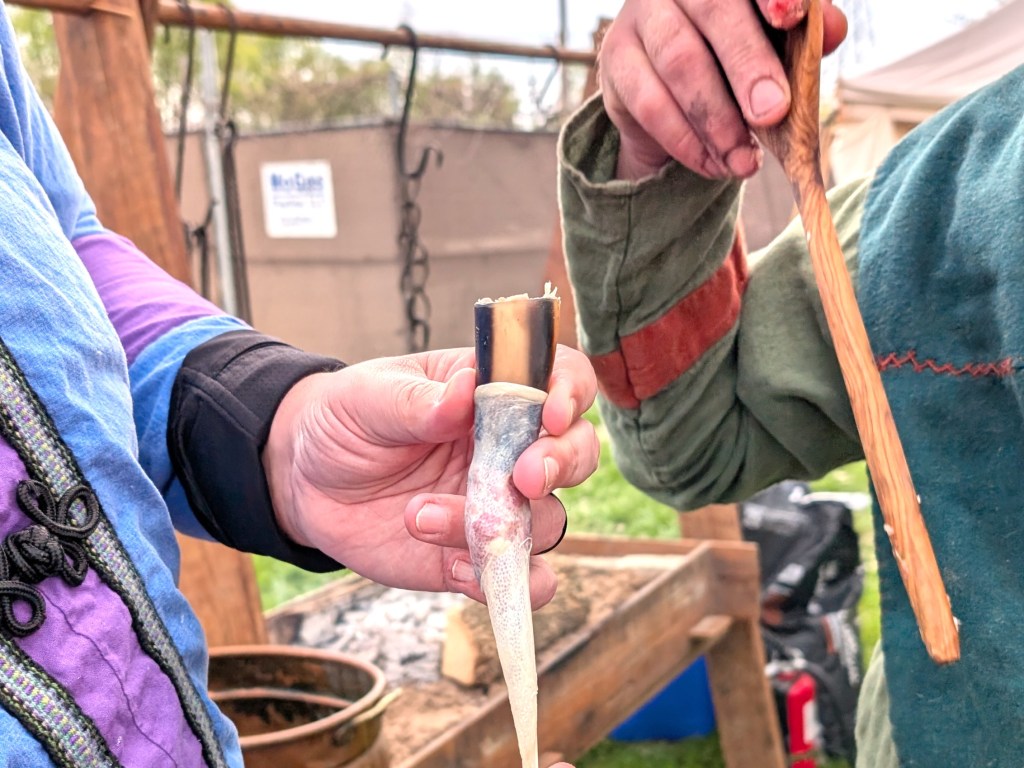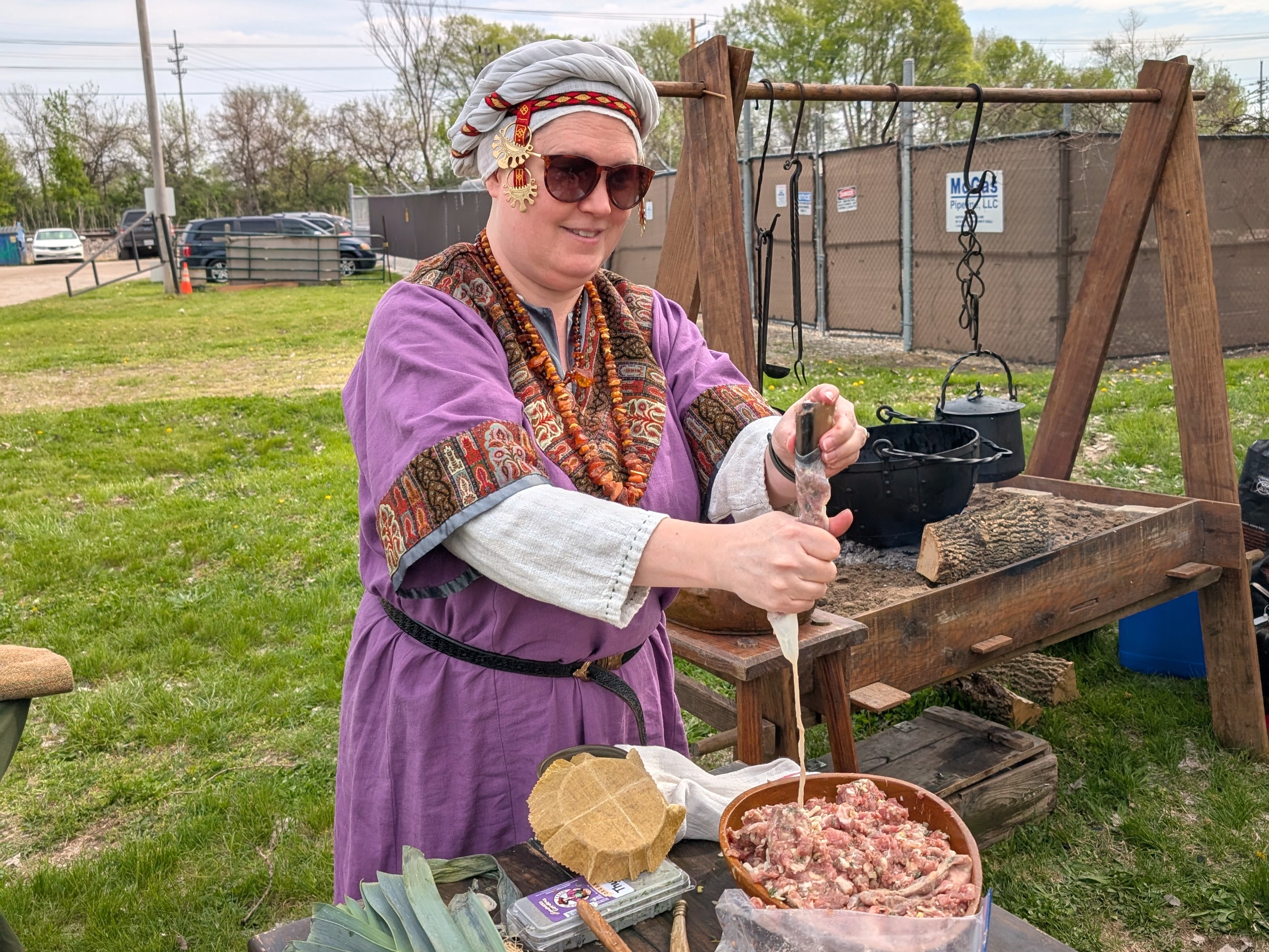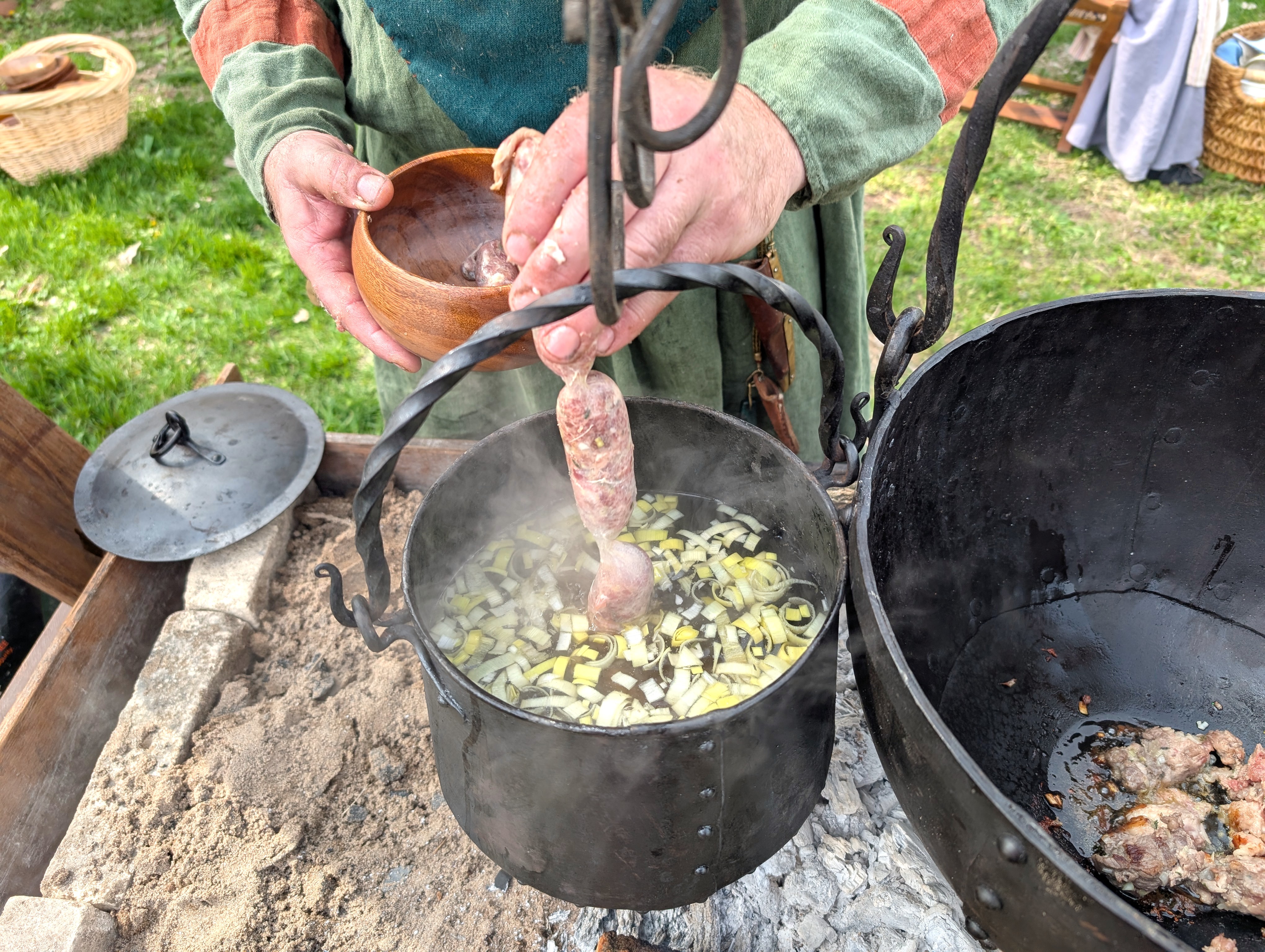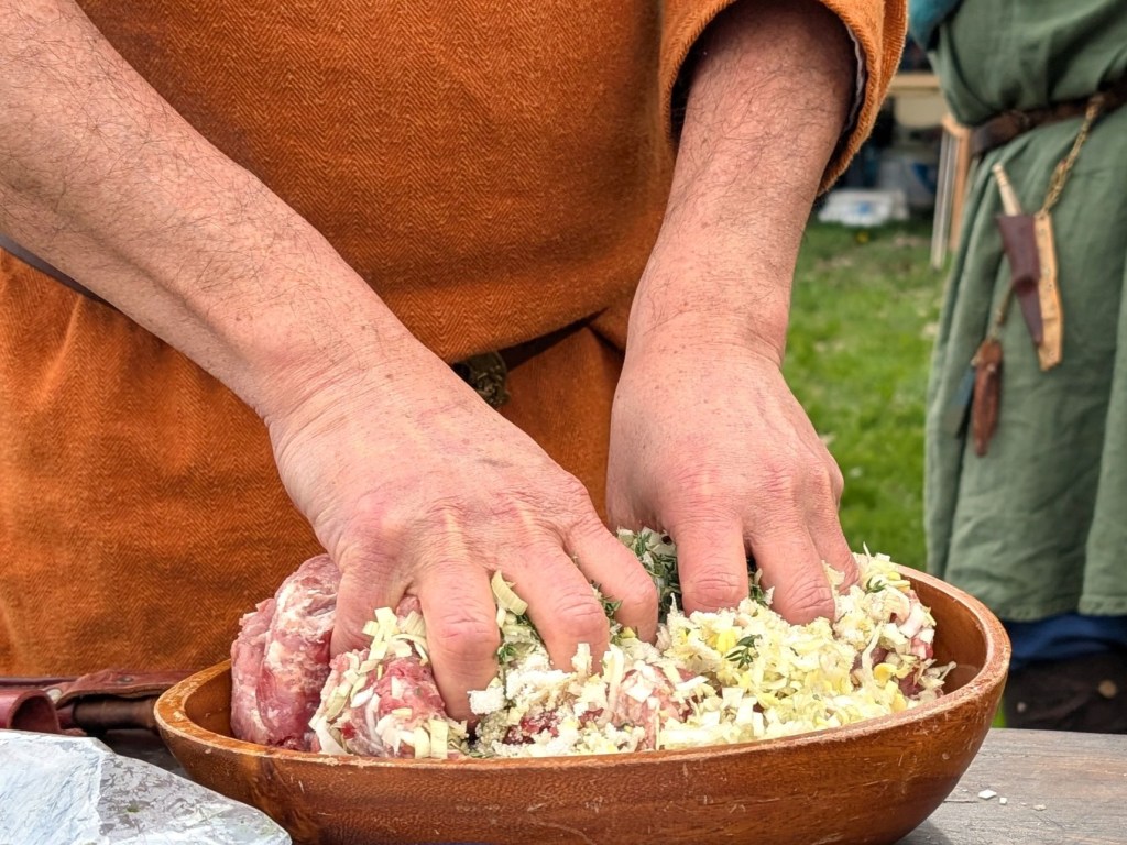 This past weekend, I found myself at the intersection of my cooking hobby and my other hobby: living history. At the recent Fire Arts Symposium near St. Louis, I took a class on making “Kettle Worms” (Viking-age sausage) and learned the process for making this dish with period tools over open coals. Who wouldn’t want to eat sausage like a Viking?