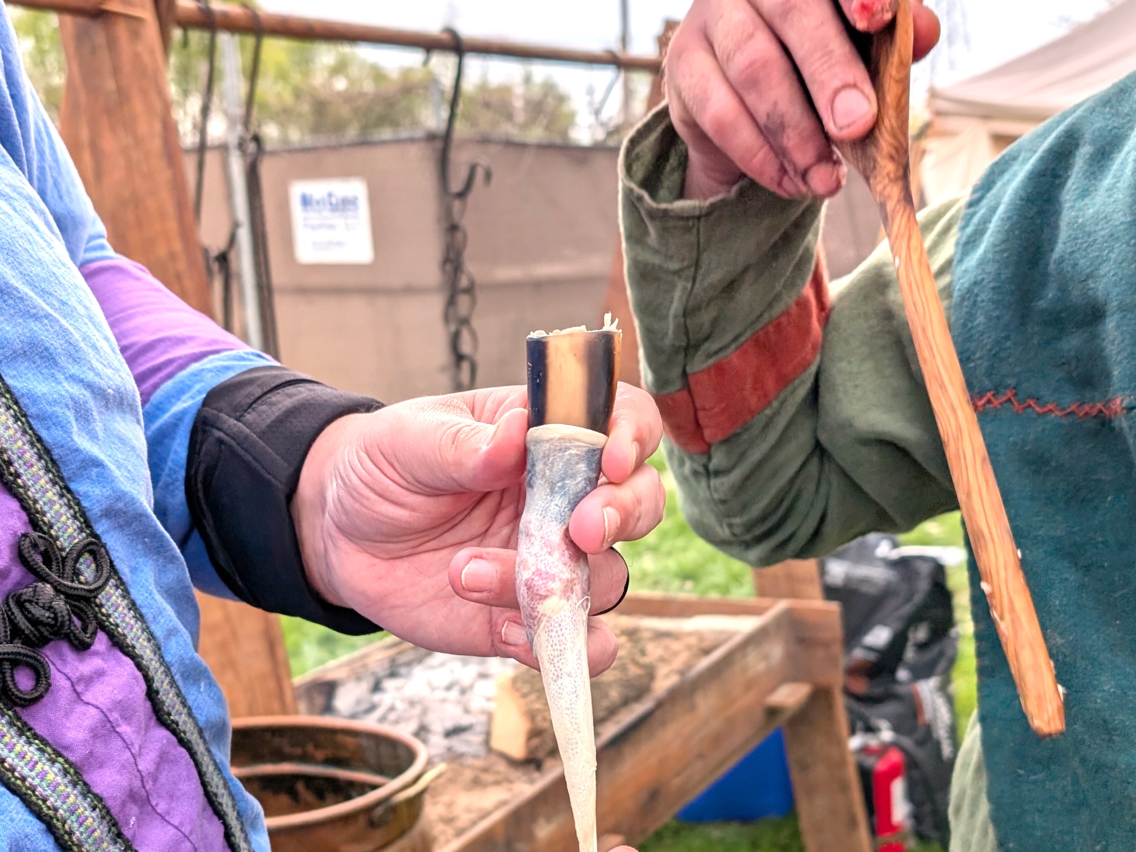 To make the sausages, you could use modern equipment to stuff them, but if you want to stuff sausage like a Viking (or, more specifically, a Viking-age Norse cook), you’ll need to forego the KitchenAid. The period method was to use the sawed-off tip of a cow’s horn — it should be a tube roughly 3 inches with a hole on each end, sanded smooth. If you don’t have easy access to this type of thing, a wide-mouthed tip for a piping bag will also work.