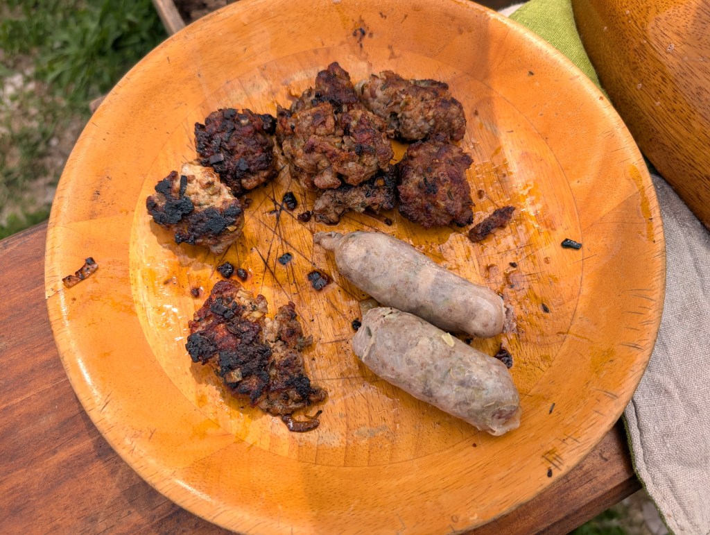 Compared to more modern sausage recipes, the seasoning in this version is very simple, yet surprisingly flavorful. It consists of three types of meat (pork, beef, and bacon), leeks, and thyme. Historically, it was boiled, though you can also smoke it or fry/grill if you prefer. I found that boiling didn’t impart as much of a smoky flavor as you’d get if you smoke the sausages. The patties we made from the sausage mixture gained a bit of smoke from cooking over an open fire, plus some flavor from browning the meat. As such, I’m suggesting an optional addition of liquid smoke if you know you won’t get smoke in your sausages otherwise and really want that flavor.